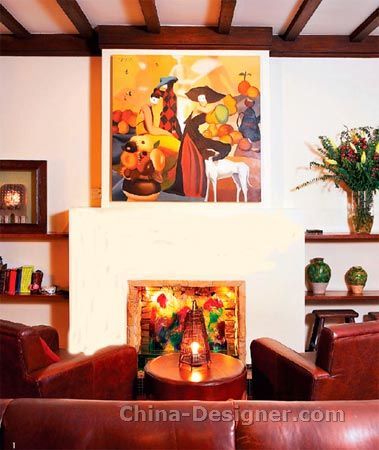 起居室里,一輪故意做舊的棗色皮質(zhì)沙發(fā)圍出了視聽區(qū)域,電視機(jī)背后鮮艷的大色塊裝飾畫、小巧剔透的水晶墻面立燈和印花編織地毯交相輝映,循序漸進(jìn)地豐富著色彩。皮沙發(fā)的背后是客廳的另一側(cè),廢棄的壁爐被主人精心打造成一件裝置藝術(shù),底部由馬賽克鋪出一個(gè)小小的池塘,篝火處安置著一件形似火焰的琉璃雕塑,通透斑斕的色彩倒印在池塘水中呈現(xiàn)出水火交融的意境,可算是客廳里最高調(diào)的裝飾了。兩個(gè)單人沙發(fā)圍在壁爐前,中間放著同系列的皮質(zhì)茶幾,由一個(gè)竹簽編制成燈罩的小臺(tái)燈點(diǎn)綴。從背后望去,這樣的組合像極了老電影中的道具,仿佛時(shí)光交錯(cuò),浮現(xiàn)出泛黃的景象:一家人圍坐在篝火前翻著老相冊(cè)念著老故事,咖啡香飄,溫情滿溢。