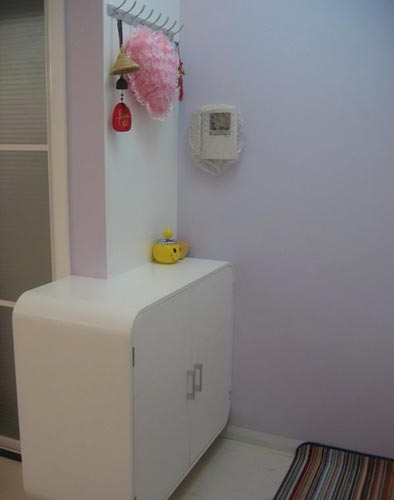 鞋柜為了迎合我們提前看好的OOD的電視柜,是仿照OOD做的圓角,門上的凹槽自己想的,效果不錯(cuò)!木工小何把鞋柜懸空了,說(shuō)是這樣好打掃衛(wèi)生,看起來(lái)也洋氣吊頂是仿照照片做的,玄關(guān)還差串珠簾