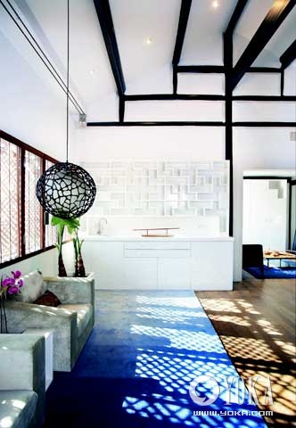 其中最獨特最出彩的設(shè)計就是對中國傳統(tǒng)的菠蘿格的運用。設(shè)計師將原建筑的外立面墻體打掉,改為落地玻璃長窗,其外部再用菠蘿格整個包裹。菠蘿格的格子疏密有間,讓自然光充分地射入室內(nèi),解決了傳統(tǒng)民居陰暗、昏沉的問題。而光影的變幻又讓建筑內(nèi)從晨到昏及至夜晚,都充滿不同的自然情趣。在這樣的建筑中,光影可以告訴你時辰,陽光和月光的轉(zhuǎn)化可以告訴你日夜的更迭,讓人在自然氣息之中回歸寧靜。