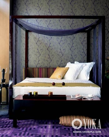 臥室中色調(diào)柔和的布藝床頭莊重典雅而不乏輕松浪漫的感覺,與灰紫色暗花紋壁紙和深紫色的格紋地毯相互呼應,多層次的色彩變化,中和了深色家具帶來的冷靜,帶有灰度的柔和色調(diào)讓整個房間停留在雅致迷人的氛圍里。