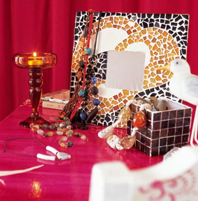 透明的馬賽克可以用來做燭臺,因為燭光能夠透過馬賽克朦朦朧朧灑出來,又不似透過普通玻璃那樣直白。還有實用的紙巾盒、花瓶都可以用馬賽克來制做,一樣的餐桌不一樣的風情。