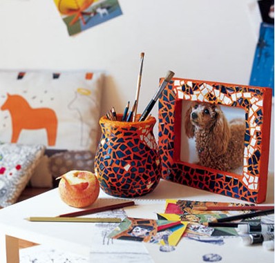 即便是最普通的陶瓷馬賽克,換一種彩色填縫劑,也能變成精彩的桌面裝飾。做相框的馬賽克,既可以一片一片整齊排列,也可以敲碎之后隨意拼貼,隨心情不同,效果也不相同。