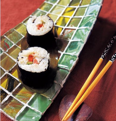 看慣了家里的平盤,這款自由扭轉(zhuǎn)的壽司盤是否給了你一點點驚喜?新型的玻璃馬賽克本身就有裝飾的花紋圖案,有點寫意,很適合做壽司盤,強化了它濃濃的東方味道。不過,由于它不是平的,制做起來就多了道工序,兩層馬賽克之間就需要夾進一層薄的鐵板或者鐵網(wǎng),以固定它的造型。