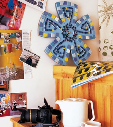 一款普通的花形掛鐘,因為馬賽克的參與而精彩。馬賽克拼花在視覺上給人美感,由于沒有填縫,高低錯落更有一種立體感,當嘀嗒嘀嗒的聲音把你的目光吸引到這朵花上的時候,你是否聞到春的氣息?