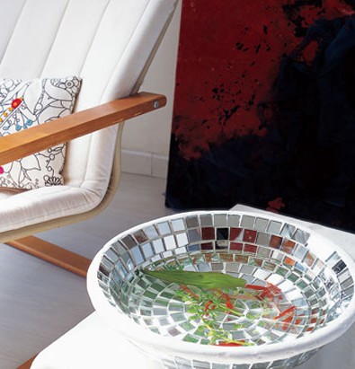 鏡面馬賽克在家中也有不同凡響的裝飾效果。把它貼在魚盆上,由于鏡面的反射,幾條魚仿佛變成了千百條魚,好不熱鬧。光照到魚盆上,反射到墻面、屋頂,星星點點,隨魚兒游動而閃爍,讓人驚喜不已。