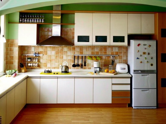 小廚房的使用面積有限,在整體色彩安排方面,切忌花花綠綠。特別注意不能使用印有立體感圖案或明暗對(duì)比強(qiáng)烈的裝飾材料,否則不僅會(huì)使廚房面積在視覺上顯得狹小,而且不易清潔。