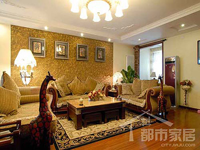 在硬裝方面,設(shè)計(jì)師僅僅是做了一層簡(jiǎn)潔的吊頂來表現(xiàn)歐式風(fēng)格而已,歐式風(fēng)格還是主要靠軟裝來表現(xiàn):家具、燈飾,以及暗金色的壁紙背景墻都非常符合歐式的主題。顏色上的高度協(xié)調(diào)使得客廳的整體效果渾然一體,主題明確。