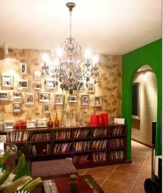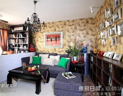 客廳,一面墻設計成書柜,收柜做得比較低,上面可以放物品,這面墻做成了一面記憶墻,照片,裝飾畫,都可以掛在上面,親朋好友來了,還是一道不錯的風景線呢。