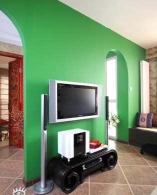 在兩個門的中間設了一個綠色電視墻,感覺上很新穎,效果也不錯。