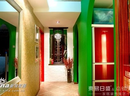 過道,紅綠形成鮮明對比,同時加上了金色暗花壁紙,整體給人亮麗的感覺