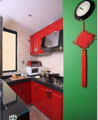 廚房,紅的櫥柜,一面綠色的墻,還掛上了紅的中國結(jié),整個一實實在在的紅綠對比,卻也恰到好處地讓色彩大膽展現(xiàn)。