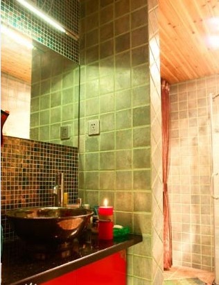 淡綠色小瓷磚,在燈光的照射下,隱隱顯出綠色的光來,這種巧妙的設計很隱形地形成紅與綠的對比