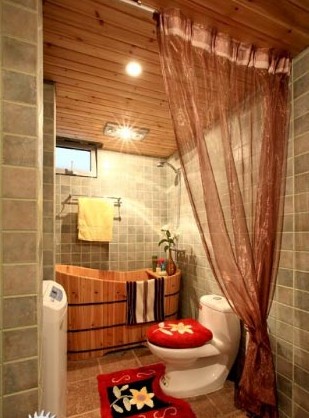 紅色的小地毯和紅色的坐墊,很精致舒適,輕盈的紗簾給浴室籠罩出一種浪漫的感覺