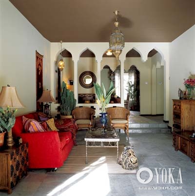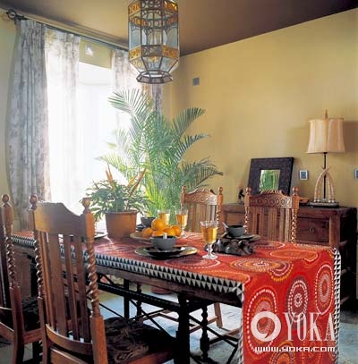 墻面上大地色系的赭石、土黃,取代了非洲土著的茅草泥坯房的天然景象??蛷d、餐廳、玄關(guān)處的埡口形同清真寺的剪影。餐布上扎染的圓形圖案,仿佛是為了不辜負(fù)非洲那“太陽(yáng)之子”的盛名而傳遞熱烈的驕陽(yáng)。銅制打花的玻璃燈,是房間里最奢侈的一項(xiàng)開(kāi)支,卻也是讓人翹首贊美的點(diǎn)睛。被噴燈火燒火燎過(guò)的松木門,終于熬過(guò)了“酷刑”,有了笑看風(fēng)云的脫俗氣度。