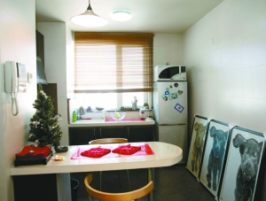 家里的廚房之所以敢做成開(kāi)放式,是因?yàn)镾now說(shuō)她不經(jīng)常在家做飯,但朋友來(lái)時(shí),在小餐臺(tái)上喝茶聊天的機(jī)會(huì)較多,所以這個(gè)小空間被收拾得十分溫馨。白色冰箱上貼著各種動(dòng)物造型的冰箱貼。墻邊擺著三幅畫(huà)得像豬一樣可愛(ài)的大狗,瞪著門(mén)口,“問(wèn)候”剛進(jìn)門(mén)的朋友。
