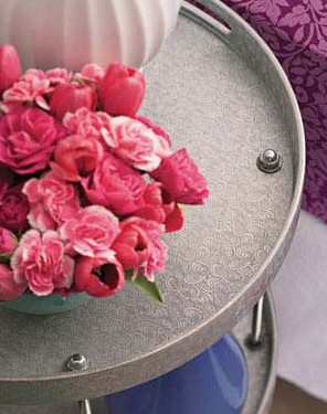 三個托盤、一些五金零件就能組成一張床頭桌!到五金商店購買4根90厘米長的金屬桿、24個墊圈、20個螺母、8個螺帽。在托盤上等距離鉆孔,注意每只托盤上的鉆孔要能對得上。將托盤組裝到一起并固定牢,在支撐桿頂部與底部加螺帽。銀色小桌是床頭的亮點(diǎn)搭配,書籍、鮮花、臺燈各居其位,時尚又實用。