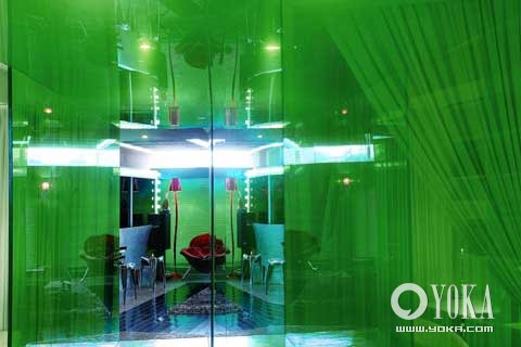 這種帶著跳躍性思維的布局方式在客人進(jìn)門的第一眼就帶來了新奇,然而,真正使人感到有冷酷仙境之美的,是貫穿在房間中的那個(gè)綠色有機(jī)玻璃的走廊。它帶來了強(qiáng)烈的視覺效果,不禁使人對通道里隱隱約約的艷麗世界充滿好奇。