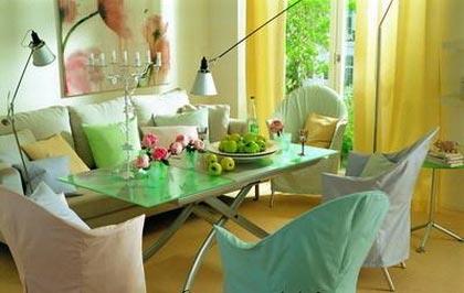 在整體空間面積不大的房子中,可以不專門開辟就餐區(qū),將玻璃餐桌往“玻璃墻”邊一靠,通過(guò)鏡子的效果,讓整個(gè)空間得到了充分的利用和延展,同時(shí)有效地讓視覺(jué)空間得以放大。