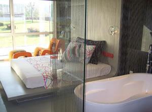 剛剛不是說完了如廁的問題嗎,現(xiàn)在要說洗澡的問題了,天然就是要透明唄,把洗澡這個(gè)私密的事也擺到明處來辦,正如圖中所示,看看效果如何,試試你的膽量如何。