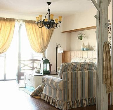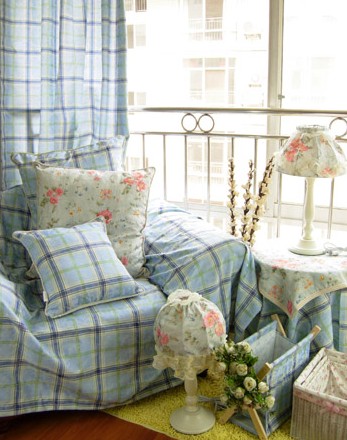 在室內(nèi),窗簾、桌巾、沙發(fā)套、燈罩等均以低彩度色調(diào)和棉織品為主。素雅的小細花條紋格子圖案是主要風格。
