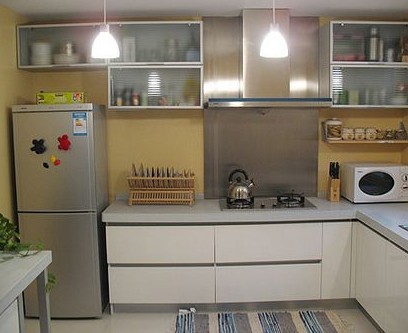 圖一中的廚房就是通過(guò)局部重色的點(diǎn)綴,然后配比大面積的淺色系地磚,讓居室空間看上去高挑但又不失重點(diǎn),葉國(guó)密說(shuō),開(kāi)放式廚房的頂面采用磨光的黑色石材,表面光滑如鏡,能夠反射居室光線,與高亮度地磚形成強(qiáng)烈對(duì)比,這種方式不僅可以在開(kāi)放式廚房中使用,對(duì)于小戶型的吊頂也不失為一種劍走偏鋒的方式。