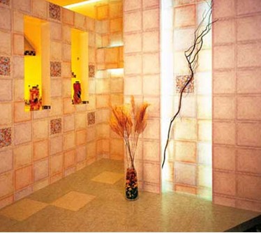 3:在一個(gè)中性的家居衛(wèi)浴間內(nèi)可以增加浴室瓷磚的互補(bǔ)色,設(shè)計(jì)師katie leavy使用12×12的藍(lán)色和金色磚在地板和浴盆周?chē)伋尚奔y,在鏡子周?chē)?×4的瓷磚做成一個(gè)框架。