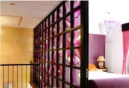 樓梯間與臥室相鄰,因?yàn)闃翘蓍g沒有窗戶,因此采光受到了很大影響。將原有的臥室墻面改造成一面玻璃隔斷,這個(gè)問題便迎刃而解了。紫色花紋的玻璃隔斷不僅與臥室主色調(diào)相一致,并且將臥室窗外的光線“引進(jìn)”到了樓梯間,讓此處的采光效果得到了極大改善。