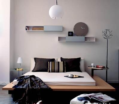 利落的線條充滿整個房間,原木色的寬邊床可移動的小幾設(shè)計周到,背景墻上錯落安置的CD架,利用材料的多元變化和幾何造型的有機融入,讓視覺呈現(xiàn)出舒緩的起伏,金屬衣架豎立要床旁,既實用又強調(diào)了空間的設(shè)計感。