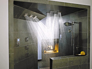水魔方花灑:充分吸納了建筑學的空間概念,花灑可因地制宜地安裝于天花板或傾斜的墻面上,顛覆了傳統(tǒng)花灑及噴頭的設(shè)計,你還可以在淋浴區(qū)內(nèi)任意方位任意角度安裝任意數(shù)量的花灑。水流可均勻充沛地覆蓋花灑表面,勾勒出圓潤流暢曲線,讓人猶如置身天然飛瀑之中。如果搭配科勒最新的DTV智能恒溫淋浴系統(tǒng),在家里就可以享受水療以及音樂、幻彩燈光理療功能。