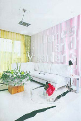 一進(jìn)門(mén)面對(duì)的就是客廳的沙發(fā)背景墻,條絨布質(zhì)感的豎條紋墻面從視覺(jué)上增加了空間高度,淡粉色的底色上用白色豎條紋做出立體字母,顏色和諧溫馨,延展了視覺(jué)空間。