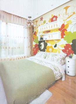 用鮮艷的大花圖案鋪滿整個(gè)墻面是需要設(shè)計(jì)水平的。花朵所用的顏色應(yīng)該控制在相近的色度上,才不顯得繁亂。在大件家具上運(yùn)用白色降低墻面顏色的飽滿度,在小件飾品上運(yùn)用類(lèi)似的圖案來(lái)呼應(yīng)墻面圖案,成為這間居室的一大亮點(diǎn)。
