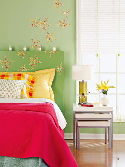 床頭的背景墻和床頭板都是純綠色,色度不一樣,可在建材賣場或網上購買墻貼,挑選跟綠背景顏色呼應的花朵圖案最能展現春的氣息。而且背景墻和背板選擇一致的圖案,統(tǒng)一性會使裝飾更顯協(xié)調。