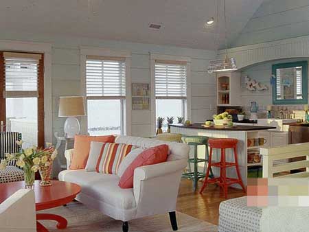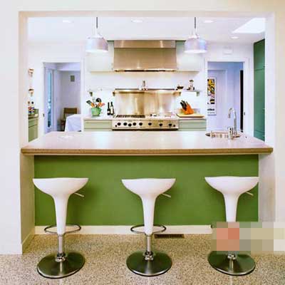 不過,廚房吧臺與客廳里的吧臺有很大的不同??蛷d是居室的重點區(qū)域,一般都裝飾得非常講究。而廚房吧臺則要與廚房、餐廳的潔凈、實用的環(huán)境相適應,造型應簡潔明快。但它畢竟又具有一定的裝飾性,所以應富于生氣,要盡量避免呆板生硬的設計。