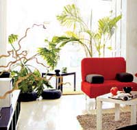 客廳客廳是家人團(tuán)聚與會(huì)客的場(chǎng)所,植物裝飾宜簡(jiǎn)樸、美觀,不宜過(guò)雜,并要考慮家具式樣與墻壁色彩來(lái)選擇合適的植物種類。大中型盆栽如散尾葵、棕竹、龜背竹等一般適宜放置在墻角:幾架上擺放蕨類、仙人掌、多肉植物等小型盆栽或四季海棠、仙客來(lái),它們的諧音能顯示出主人的熱情好客;臺(tái)面上放一些鮮切花、劍蘭、玫瑰都是極好的待客鮮花,垂直空間懸吊些綠色植物,如綠蘿、吊竹草、吊蘭等。