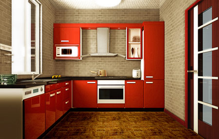 影響廚房色調(diào)的主要因素是廚房家具。為了充分利用空間來發(fā)揮廚房的各個功能區(qū)的作用,采用的各種布局形式,都會占有墻立面醒目的位置。為各個工作中心的主要設(shè)施以及為之完善的配套家具,都有占據(jù)室內(nèi)空間的造型,所余空的墻面較少。因此,當(dāng)確定了這些家具的色調(diào)時,也就等于確定了廚房的主調(diào)。天棚和地面等均可服從于家具的色調(diào)來選擇相應(yīng)的配色,以天棚和地面的配色協(xié)調(diào)于家具,或者等同于家具,地面還可以選用等同于墻面的色彩或放樣花飾來處理,會有延伸空間的感覺。