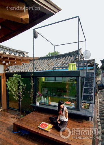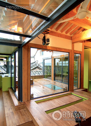 起居室內(nèi)保持了韓國傳統(tǒng)的臥地居住方式,地面的幾大塊凹槽和隔板就是他們的沙發(fā)和茶幾,同時也是用餐區(qū)域,這樣的設(shè)計大大節(jié)省了家具對于空間的占用浪費,同時也體現(xiàn)出了主人對于傳統(tǒng)生活方式的熱衷。起居室的后門一直通向庭院,這里的面積雖然不大,但是由于通過樓梯與天臺連接的方式,又一次有效地擴大了使用空間,使得這里成為家庭聚會最理想的場所。整個生活空間舒適而自由,延續(xù)了傳統(tǒng)的起居方式,同時也滿足了現(xiàn)代生活方式的需求。