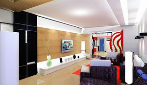 設(shè)計(jì)解說(shuō):現(xiàn)代主義的平板電視墻一般不采用過(guò)多的修飾,墻面多使用簡(jiǎn)潔的色彩作為裝飾,可設(shè)置一個(gè)低矮的柜子作為置物之用,并可在矮柜上擺放具有現(xiàn)代設(shè)計(jì)感的裝飾物。搭配上可與整體的沙發(fā)、后墻以及隔斷相配合。一般面積較小的居室里適合現(xiàn)代風(fēng)格的裝飾。