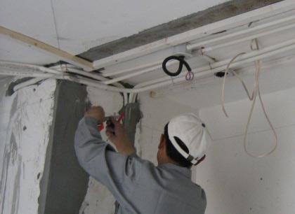 頂面的電線施工已經(jīng)基本完成,而為了保證電工程的質(zhì)量,電工師傅正仔細(xì)的對(duì)線頭逐個(gè)檢查。并將一些管線用膠帶扎在一起,保證吊頂內(nèi)部空間整潔。