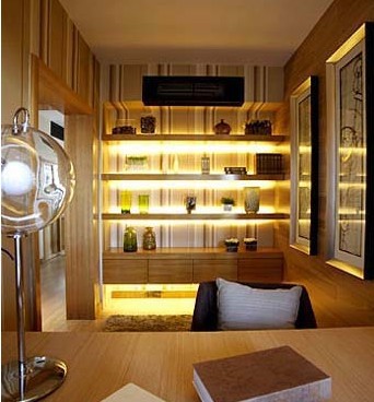 設(shè)計(jì)大面積客廳時(shí),一定要注意合理分割。木作(即用木料做成各種的架子、櫥柜等)是比較理想的選擇。如果客廳呈長方形,利用木作將短的一面墻加以延伸,更有利于擴(kuò)大空間規(guī)模的視覺印象。