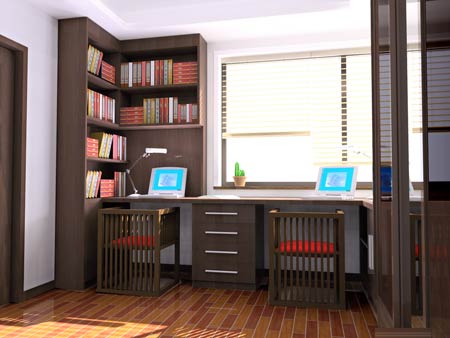 無論書桌與電腦臺是否連接,“L”形的臺面是最適合工作與上網(wǎng)的工作臺首選方案。臺面下一定要有一個足夠大的鍵盤架,最好能放得下鼠標,為了能讓雙足有充分的伸展空間,臺面下能空則空,最多加一個小推柜即可。如果有空間,在電腦臺旁擺放一個半高的小文件柜或書架,或是在工作臺的墻面上搭幾塊隔板,就會讓文件、書籍、光盤的拿取變得輕而易舉。