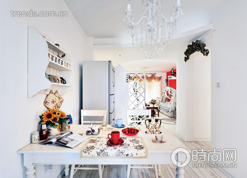 走進(jìn)雅婧的家,白色所營(yíng)造的清新氣息撲面而來(lái)。S形墻面及吊頂連接客廳與餐廳,并為這兩個(gè)區(qū)域做了自然劃分,完美的曲線造型,打破了原來(lái)客廳過(guò)道的呆板,讓整個(gè)空間靈動(dòng)起來(lái)。雅婧偏好田園風(fēng),可田園做到極致,常常是繁復(fù)的,這不是她所想要的。最后設(shè)計(jì)師決定以白色打底,仿舊淺灰的地板奠定空間的明**。墻面沒(méi)有采用慣有的壁紙做法,整個(gè)空間顯得干凈利落,后期則用裝飾物來(lái)改善空間,增加溫馨的感覺(jué)。