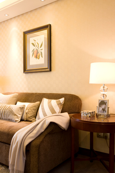 客廳空間小,設(shè)計(jì)師選擇淺色,冷色調(diào)的墻紙,來創(chuàng)造一種寬敞、雅致的視覺效果。配上素凈不張揚(yáng)的壁畫,給了客廳幾分情調(diào)。米黃色的燈光,讓房間披上了一間溫馨的外衣,讓來客感受到主人的真誠(chéng)。淺咖色的靠墊與柔軟的羊毛毯更添了幾分舒適。邊幾上用黑貝母裝飾盒和相框做裝飾來凸顯主人的品味。