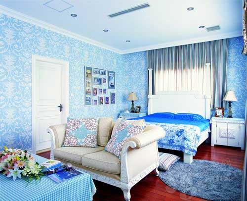 點睛:藍色的淺淡清雅,最適合作為背景色大面積使用,壁紙、墻面涂料、軟裝是藍色的活躍舞臺。要想烘托出藍色的嫵媚多變,用白色的家具和配飾進行調(diào)和最為妥當。