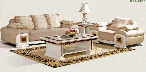 4、豪華的歐式沙發(fā)配上雕花茶幾,再現了十九世紀的華美,而深色實木茶幾讓淺色沙發(fā)于協調中不顯單調。