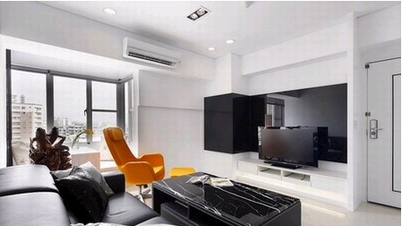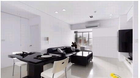 而設(shè)計(jì)師做的第一件事,就是打掉內(nèi)部隔間墻,保留兩房?jī)蓮d空間,放大的空間坪數(shù)奠定大器敞朗的簡(jiǎn)約住家基石。依照屋主喜歡且設(shè)計(jì)師擅長(zhǎng)的黑白意象,設(shè)計(jì)師利用烤漆玻璃、系統(tǒng)柜、拋光石英磚在色彩上做簡(jiǎn)單的變化,主要是利用不同材質(zhì)的介面營(yíng)造空間層次感,加大空間視感。