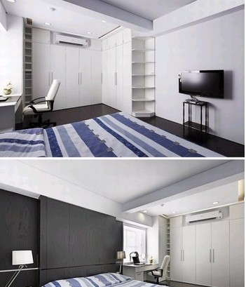 臥室:簡(jiǎn)單的臥房空間從床頭柜開(kāi)始到右側(cè)梳化區(qū)的L型設(shè)計(jì)柜體,滿滿的收納空間已開(kāi)放與不開(kāi)放的層架設(shè)計(jì)化解空間壓迫感。