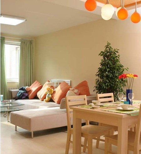 房間的顏色可以用一個(gè)詞形容“單調(diào)”。中性色彩是大多數(shù)臥室采用的——白色的主色調(diào),如果其他的裝飾品如枕頭用玫瑰粉色,再加一點(diǎn)橙色,就會(huì)使色調(diào)更加亮麗,增添新婚的浪漫感覺。