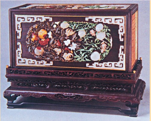這是一件用于存放糖果類食品的果盒。在清宮珍藏的帝后生活用品里,這件果盒以精湛的制作工藝、豐富的百寶嵌裝飾技法而得名。此盒為清代乾隆年間所制,紫檀盒的口徑長27.5厘米,寬22厘米,長方圓角形,通體以金星紫檀木制成,盒面上鑲嵌著藕、蓮蓬、茨茹、白菊、黃菊、芙蓉、蘭花等各色花果一簇,與盒內(nèi)放置的瓜子糖果等時令果品恰成交相輝映的特殊效果。盒面花果的稿本取自繪畫,但其效果卻遠(yuǎn)勝于繪畫,極富立體感。從藕的選料可以看出制作手法的高超,藕身用白玉,但露孔處的剖面則用螺鈿,雖然同是白色,而螺鈿的亮度和白玉不同,這就顯出藕身皮色、剖面則白色有水意的逼真效果。再有同是綠色,蓮蓬用碧玉,而菊葉用孔雀石,又出現(xiàn)不同的質(zhì)感;盒面上的蘭花采用青玉為料,紅果使用紅瑪瑙,突出了這兩種花果各自的特點。由于這件百寶嵌花果盒采用五彩奪目的玉石螺甸作裝飾,再加之紫檀木那種木質(zhì)深沉的紋理來襯托,更使這件用于盛放食品的普通容器增色不少,正如清人李漁《閑情偶記》中所說:“粗用之物,制度果精,入于王侯之家,亦可同乎玩好?!?/P>
