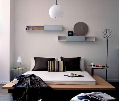 利落的線條充滿整個房間,原木色的寬邊床可移動的小幾設(shè)計周到,背景墻上錯落安置的CD架,利用材料的多元變化和幾何造型的有機融入,讓視覺呈現(xiàn)出舒緩的起伏,金屬衣架豎立要床旁,既實用又強調(diào)了空間的設(shè)計感。