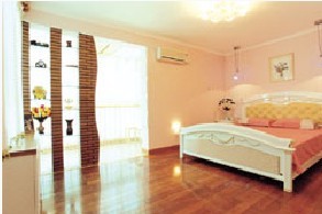 為了追求臥室空間的浪漫、溫馨,設(shè)計(jì)師選用溫和的粉紅色作為主調(diào),墻面、頂面、地板和諧搭配。由于陽(yáng)臺(tái)的啞口過(guò)寬,空間交流太過(guò)充分,所以做了紅色方磚墻柱來(lái)分割空間,美化了居室。